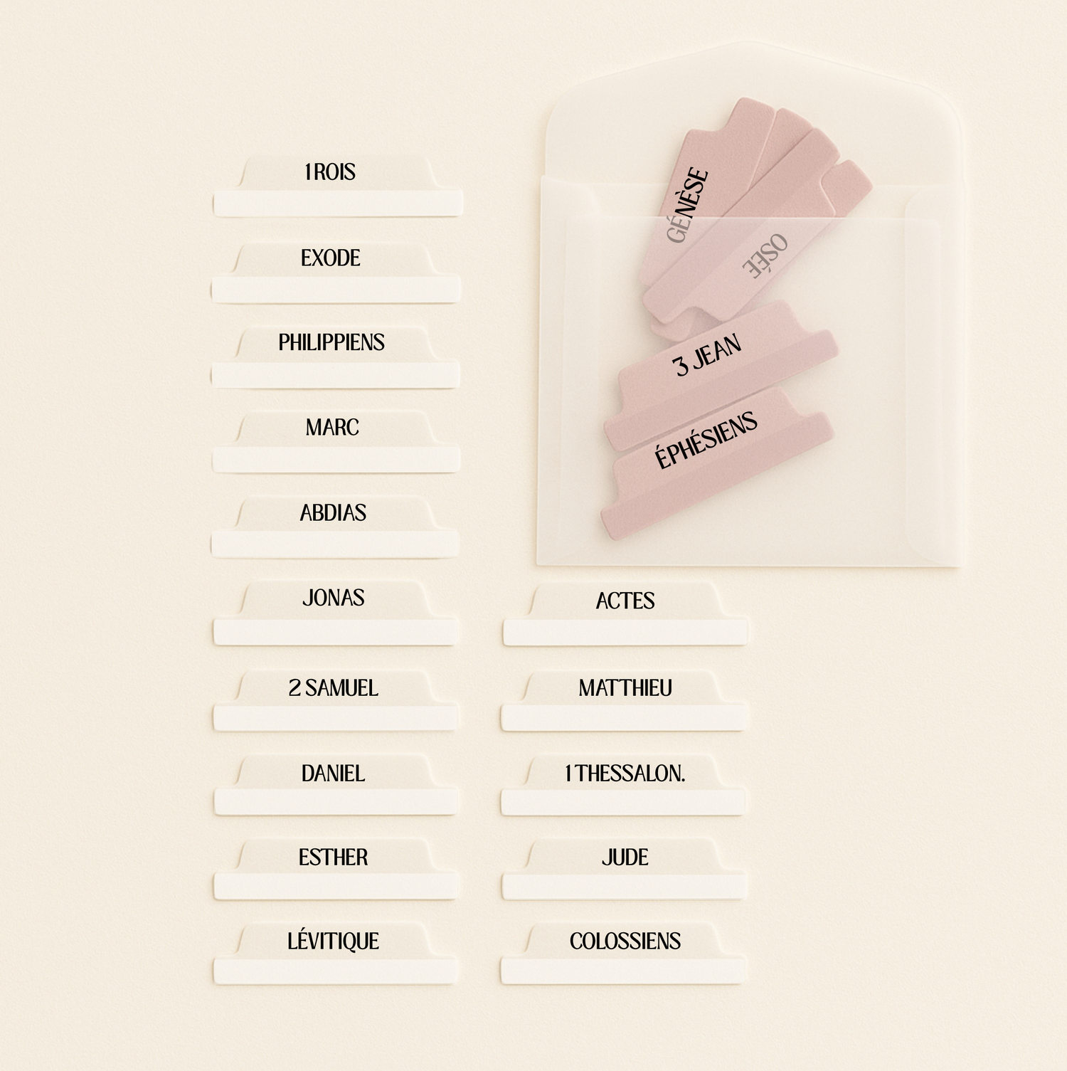 Ajoutez une touche d'élégance à votre Bible avec nos onglets luxueux et minimalistes. Parfaits pour retrouver chaque livre en un instant.