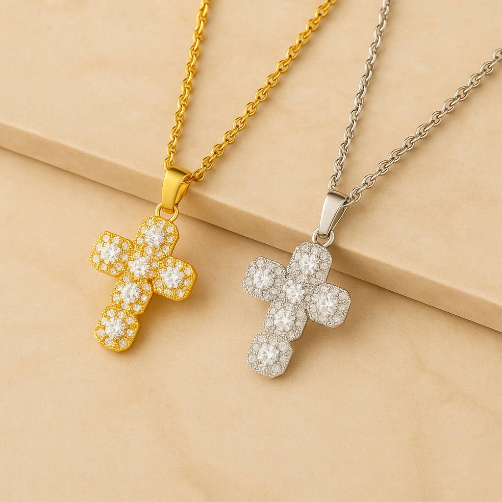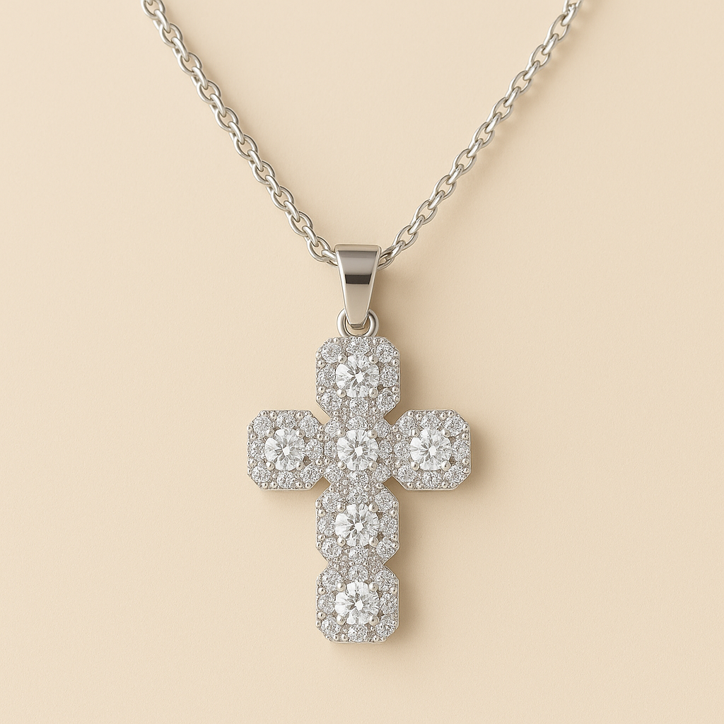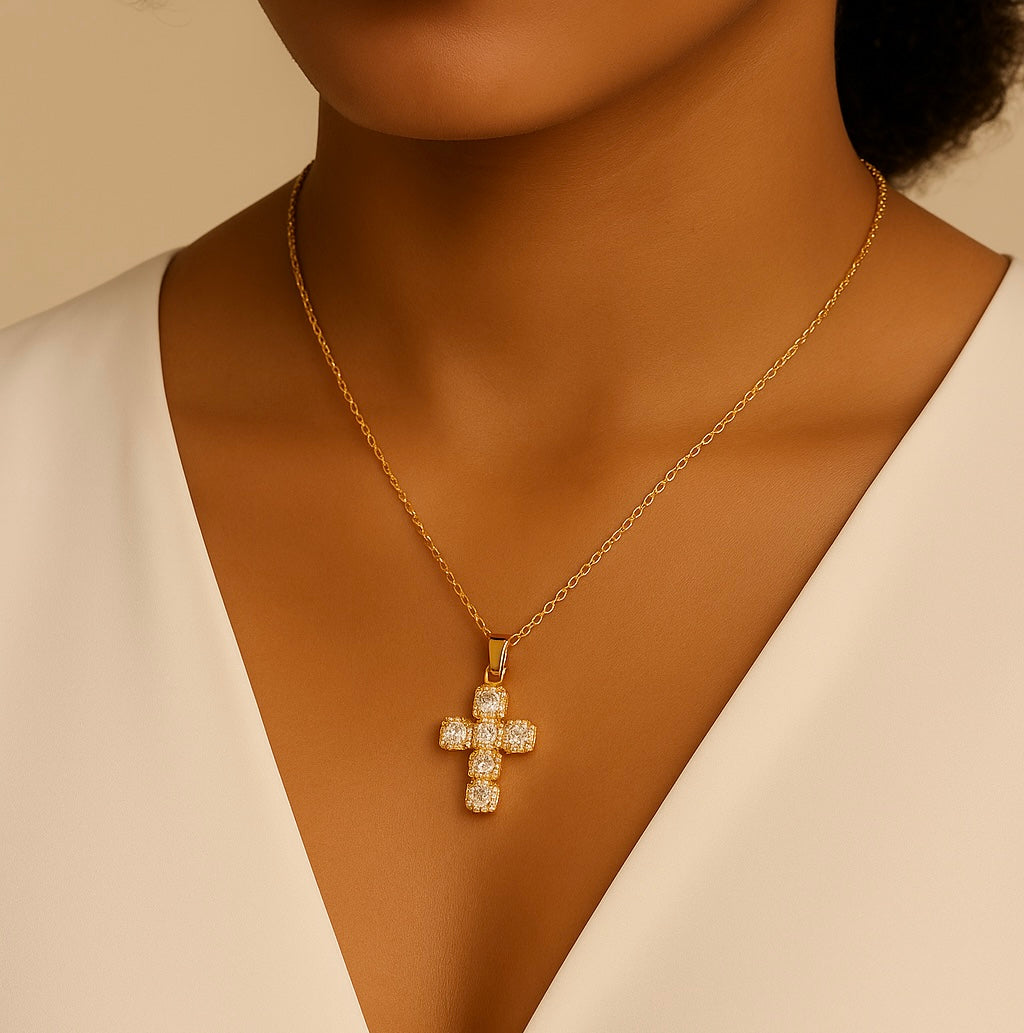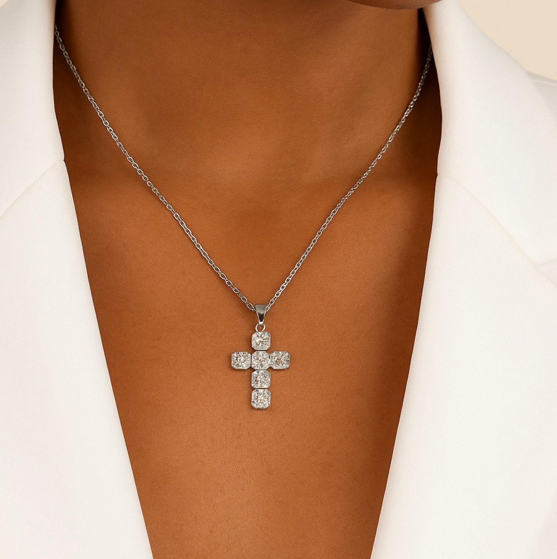 Le collier Harmonie se distingue par sa croix généreusement pavée de pierres scintillantes, dessinant une silhouette douce et affirmée. Chaque détail reflète une lumière subtile, pensée pour sublimer sans jamais dominer.