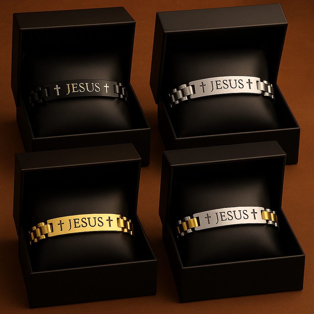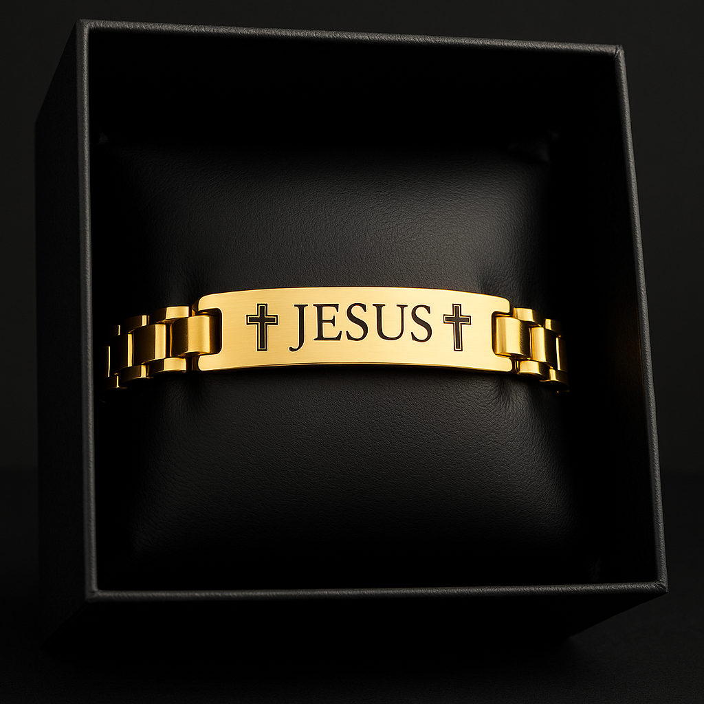 Forgé en acier inoxydable de haute qualité, il se distingue par une gravure centrale majestueuse : "JESUS", encadrée de deux croix. Un détail fort, sacré, visible — sans jamais être ostentatoire.